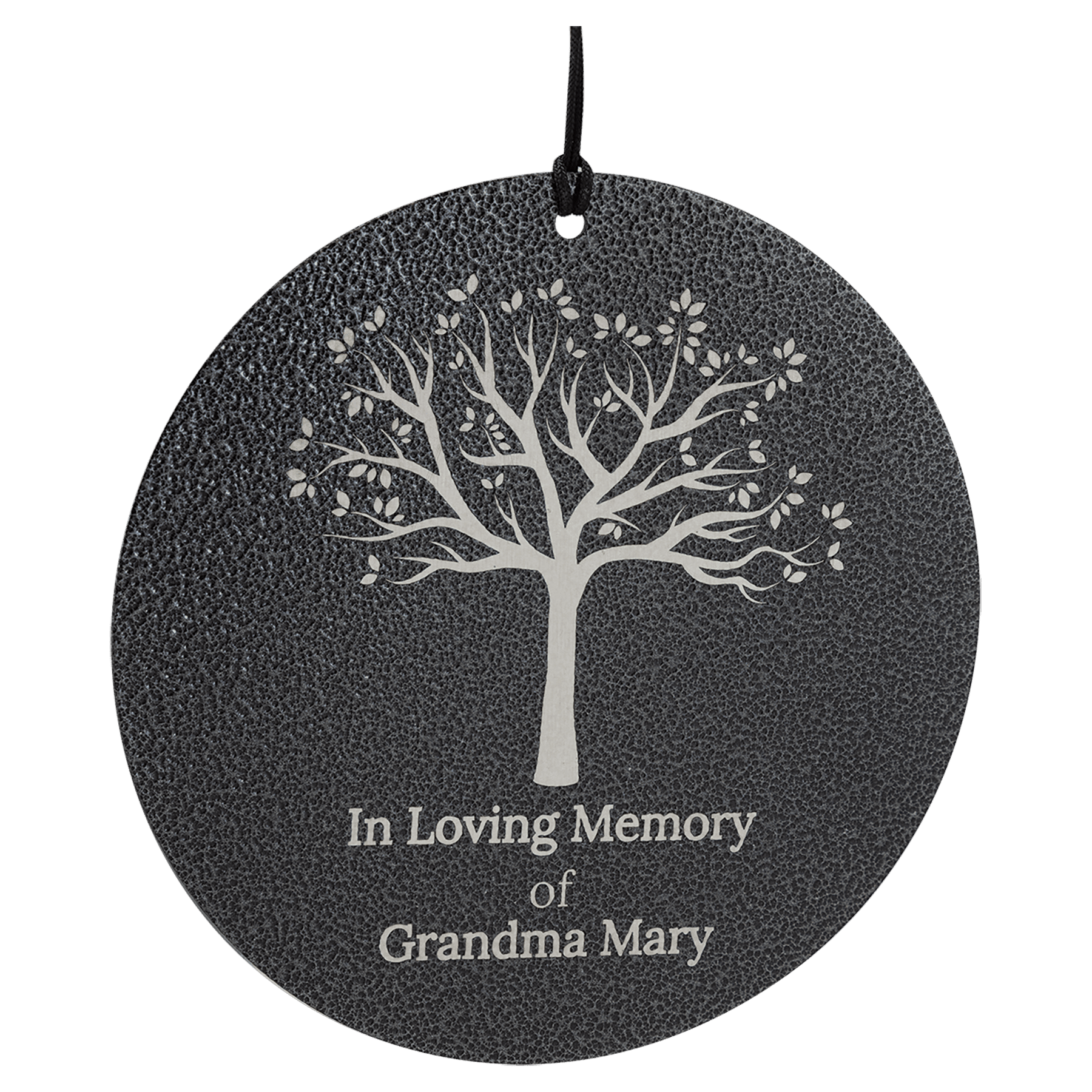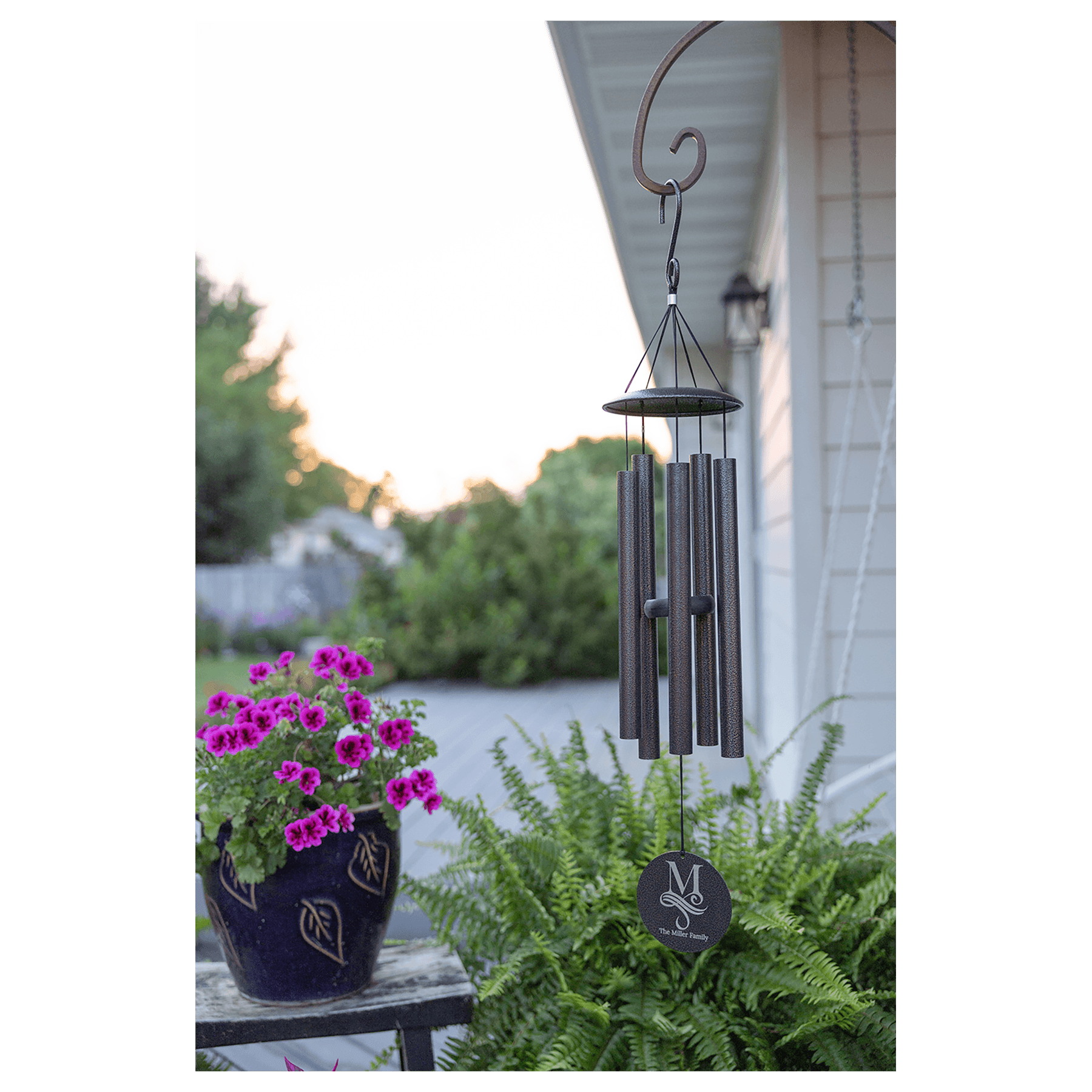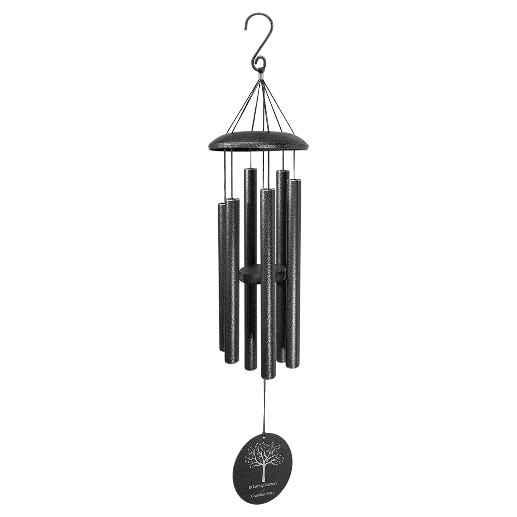 This black powder coated aluminum windchime features a 5 1/2" disc that can be personalized and 6 1" diameter tubes that range from 11 1/4" to 16" in length that produce a beautiful, rich tone in the slightest breeze. Windchimes make a perfect gift for a housewarming or any occasion.