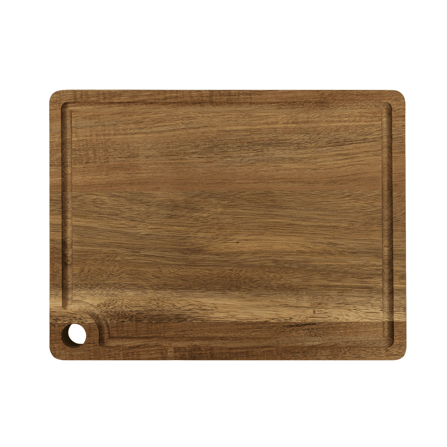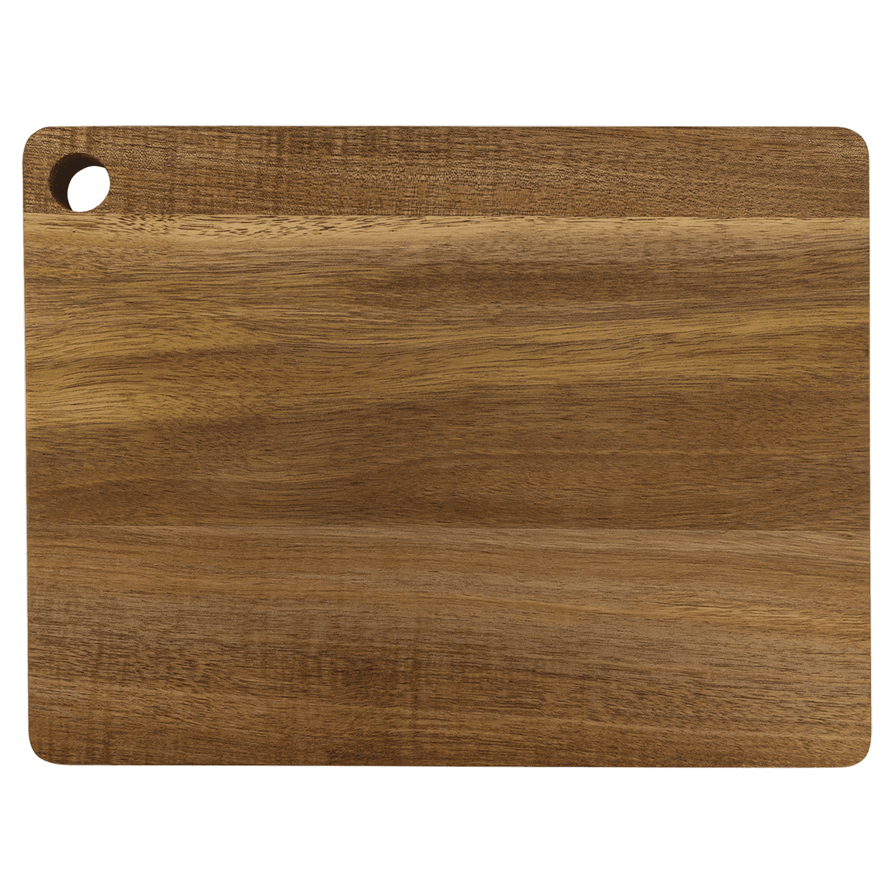 For an employee incentive, promotional item, a useful personalized gift, or decor, this stunning cutting board is a perfect choice. Crafted of genuine Acacia wood, it's naturally resistant to germs and moisture, making it an ideal choice for any home or professional kitchen. The drip ring around the edge keeps liquid messes off your countertops and the corner hole accommodates hanging or can be used as a handle.