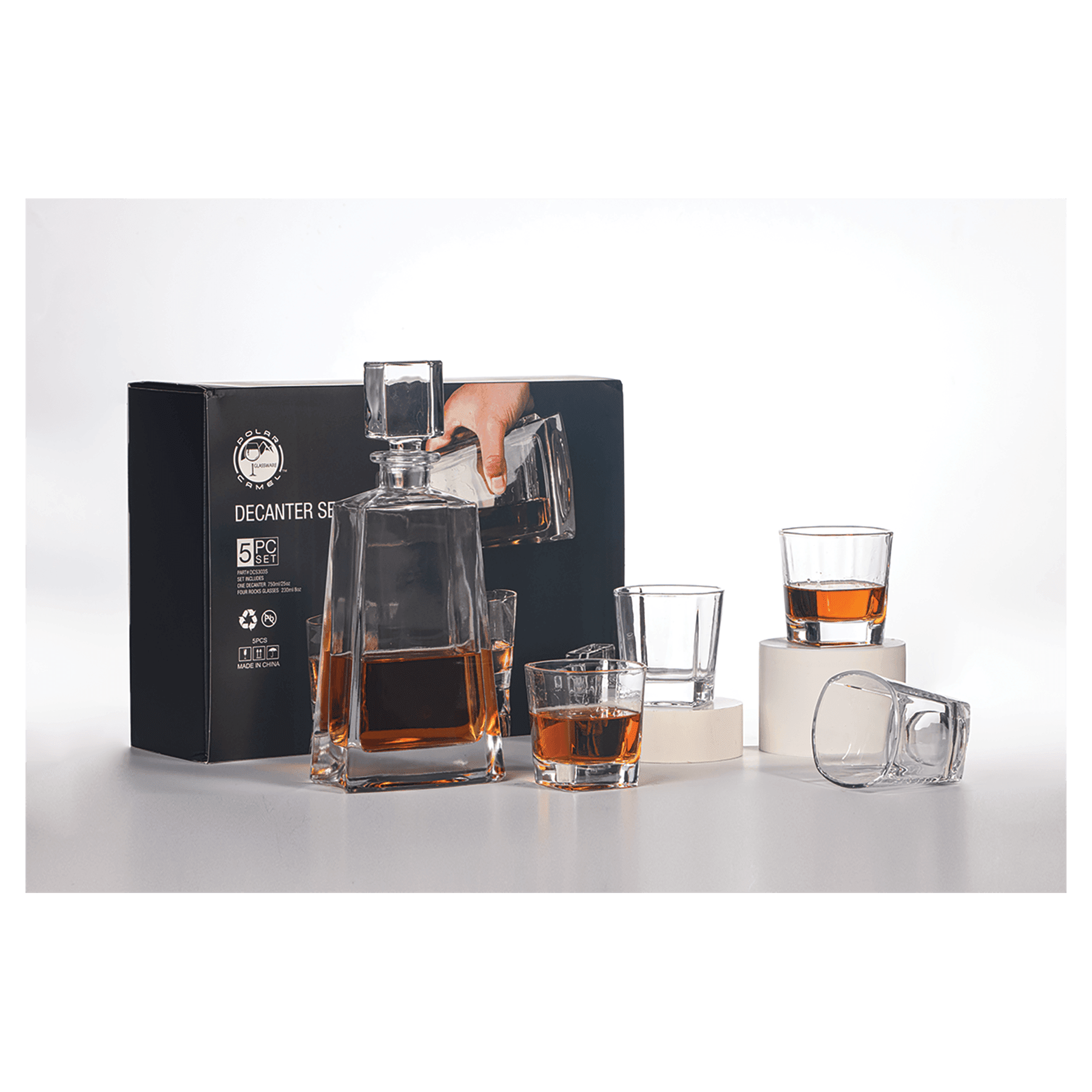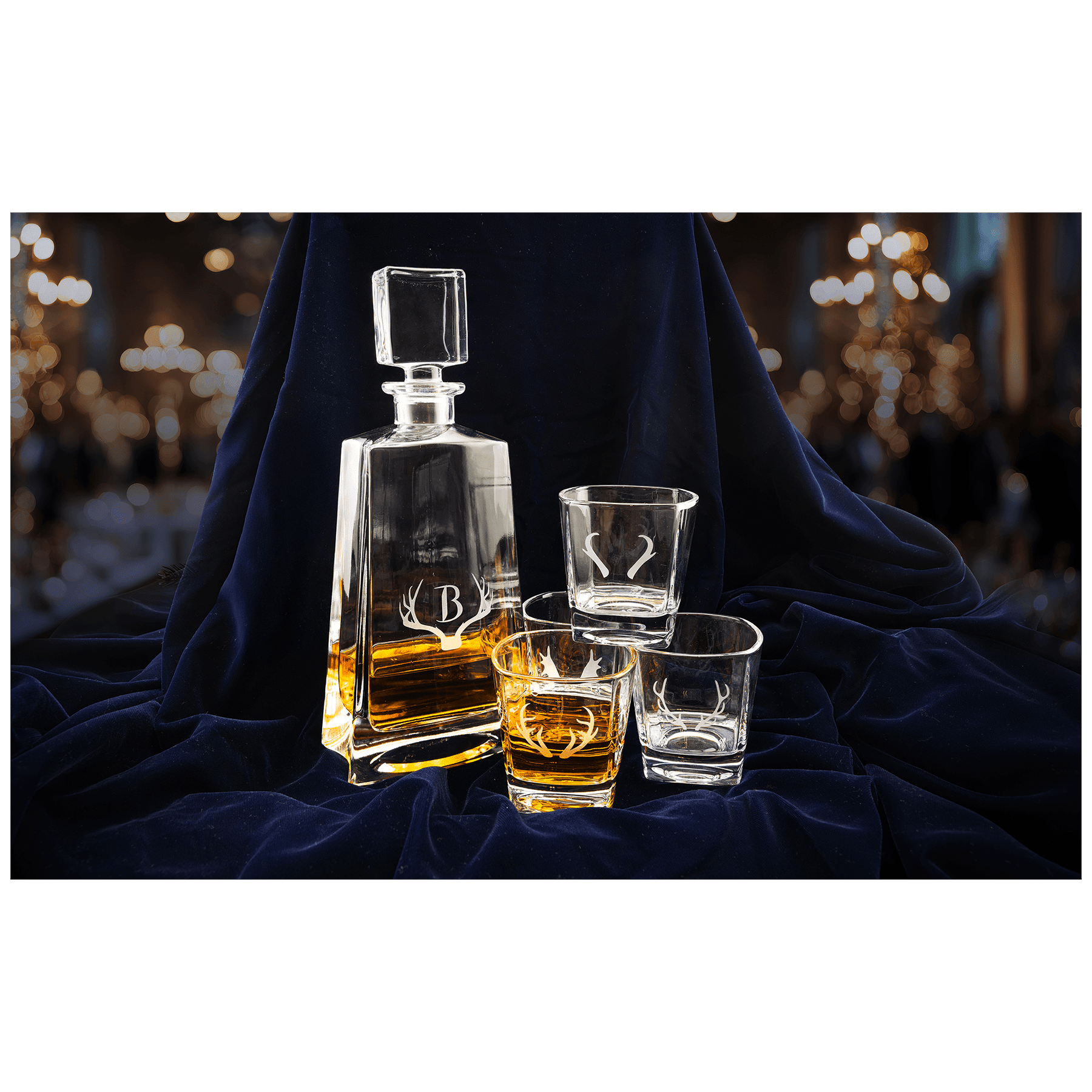 750ML 12" Tequila Decanter Set with Four 8 oz. Glasses in a Black Gift Box with Printed Paper Sleeve. Personalized Engraving Gifts shipped from USA.