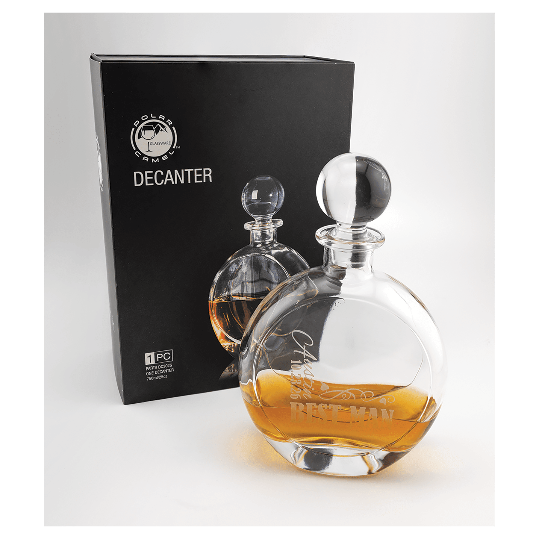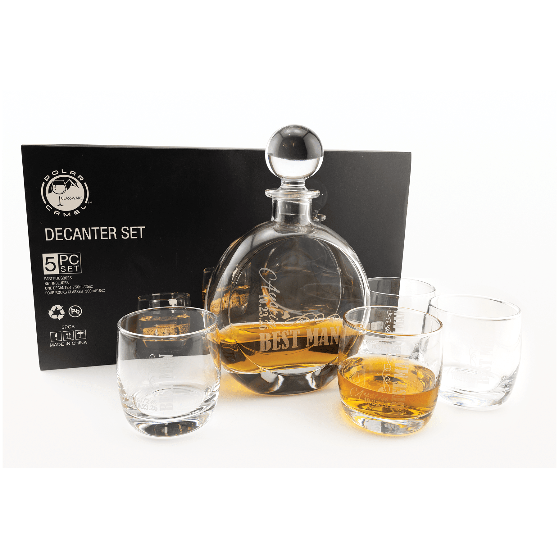 750ml Flat Round Glass Decanter Set with Four 10 oz. Rocks Glasses. Personalized Engraving Gifts shipped from USA.