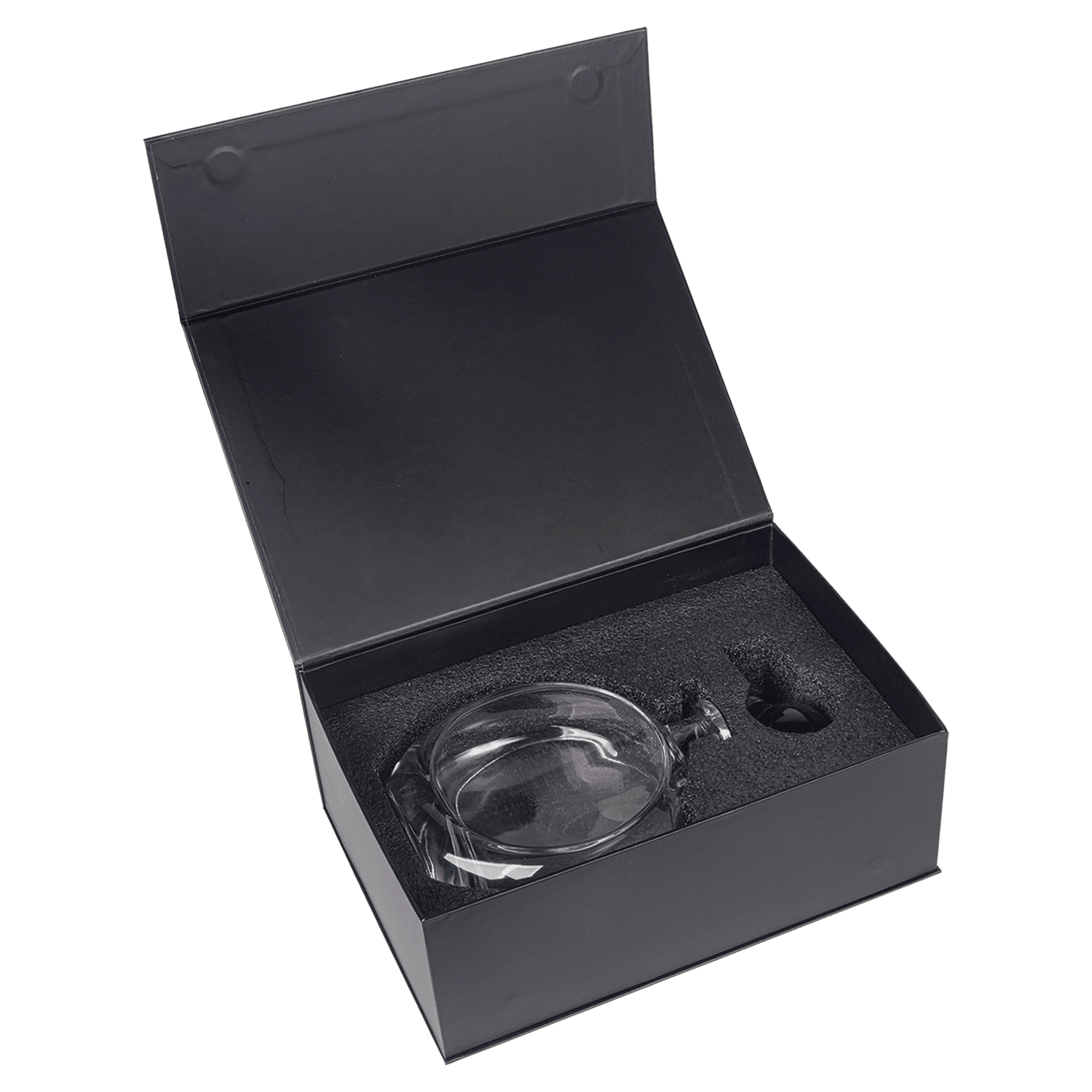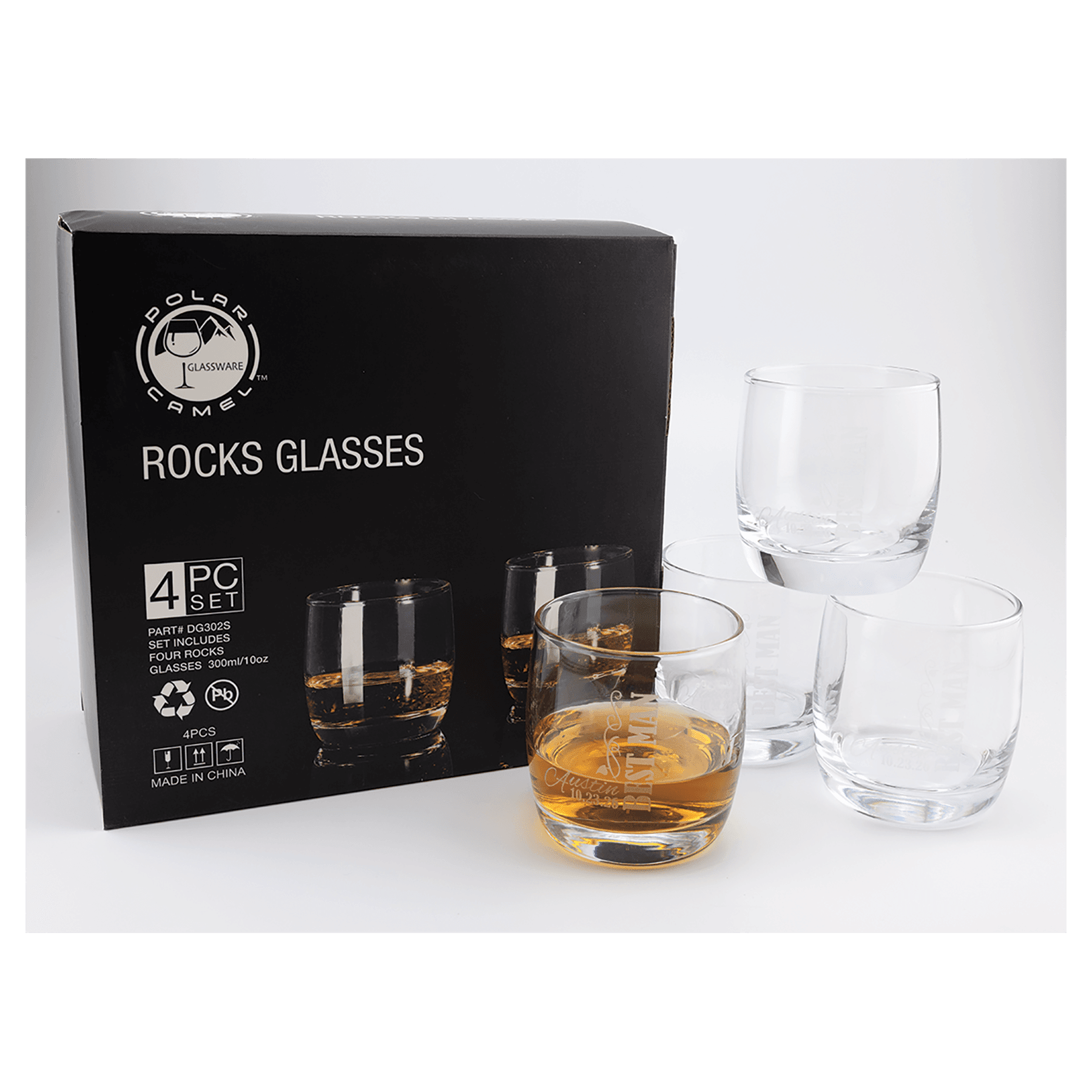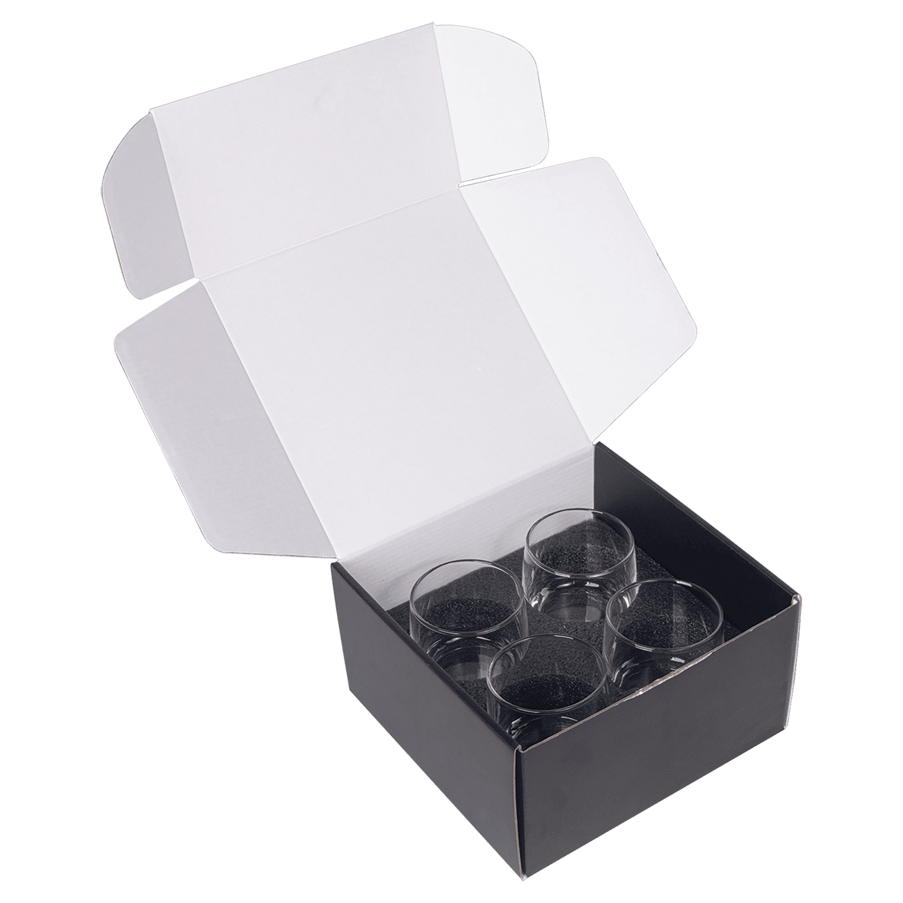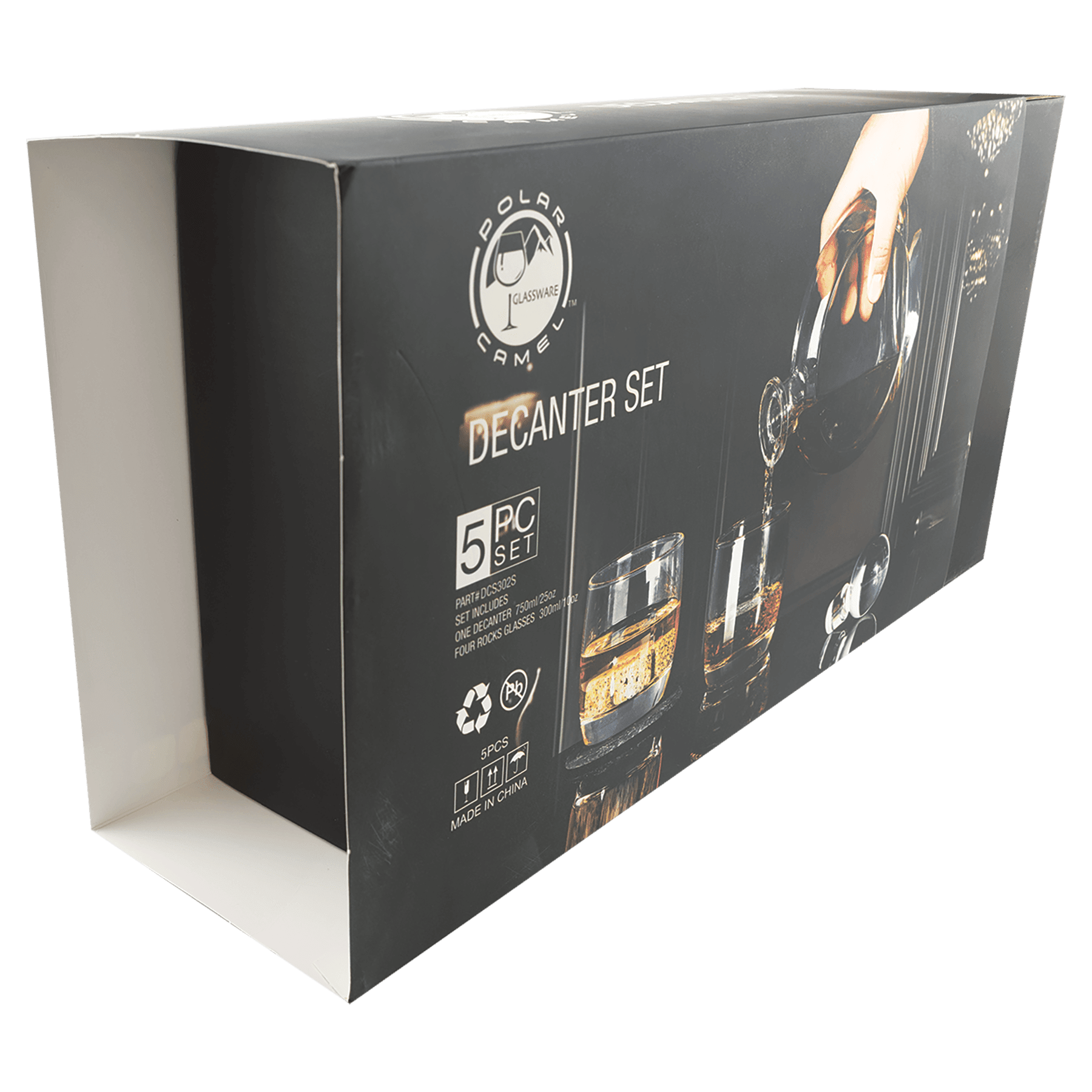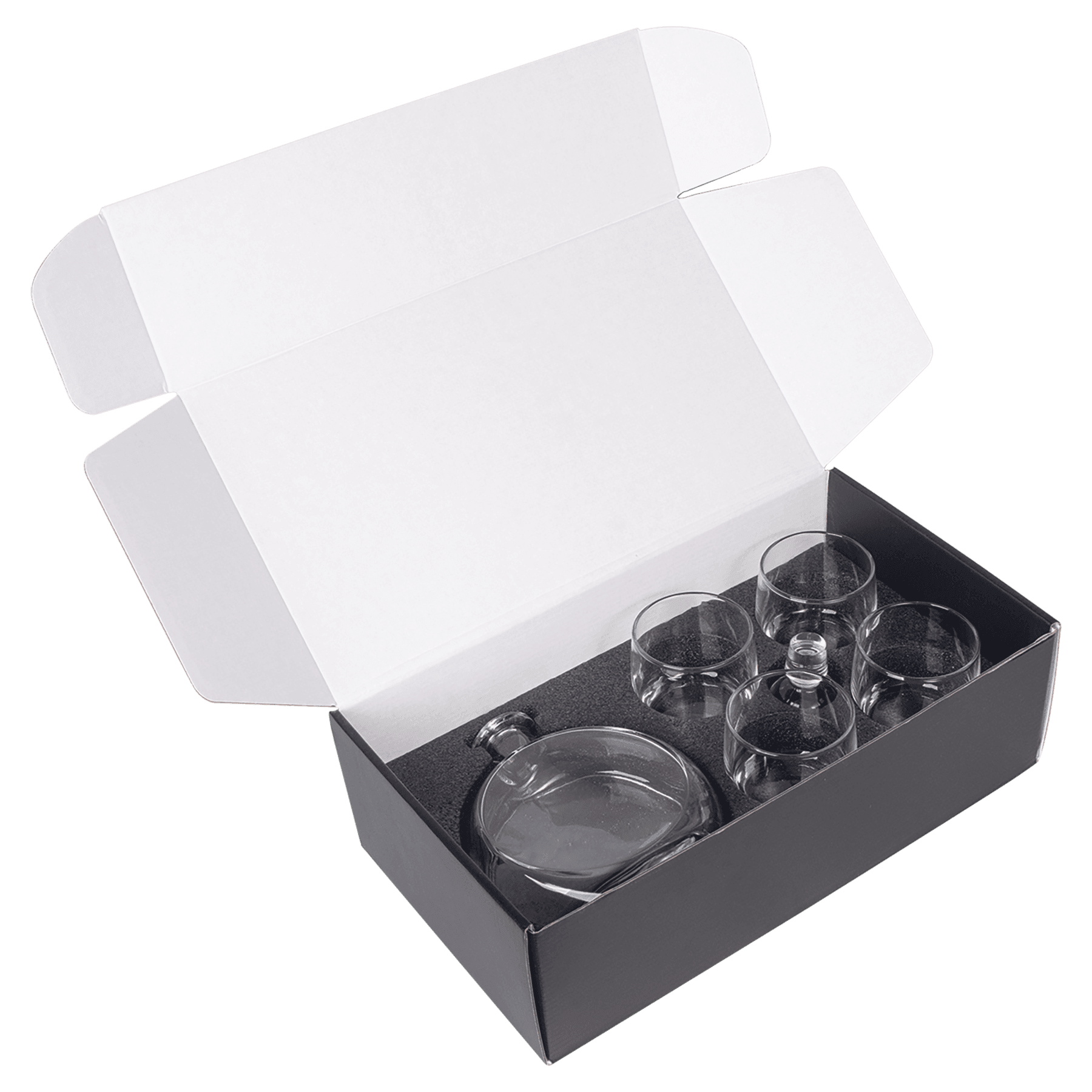 This beautiful gift set features a round decanter with a stopper lid and four 10 oz. rocks glasses. The decanter, lid, and glasses can all be personalized with a monogram, logo, or other graphics. The set is packaged in a sturdy gift box with EVA foam for protection. This set is a great choice for a personalized gift or incentive for any occasion.