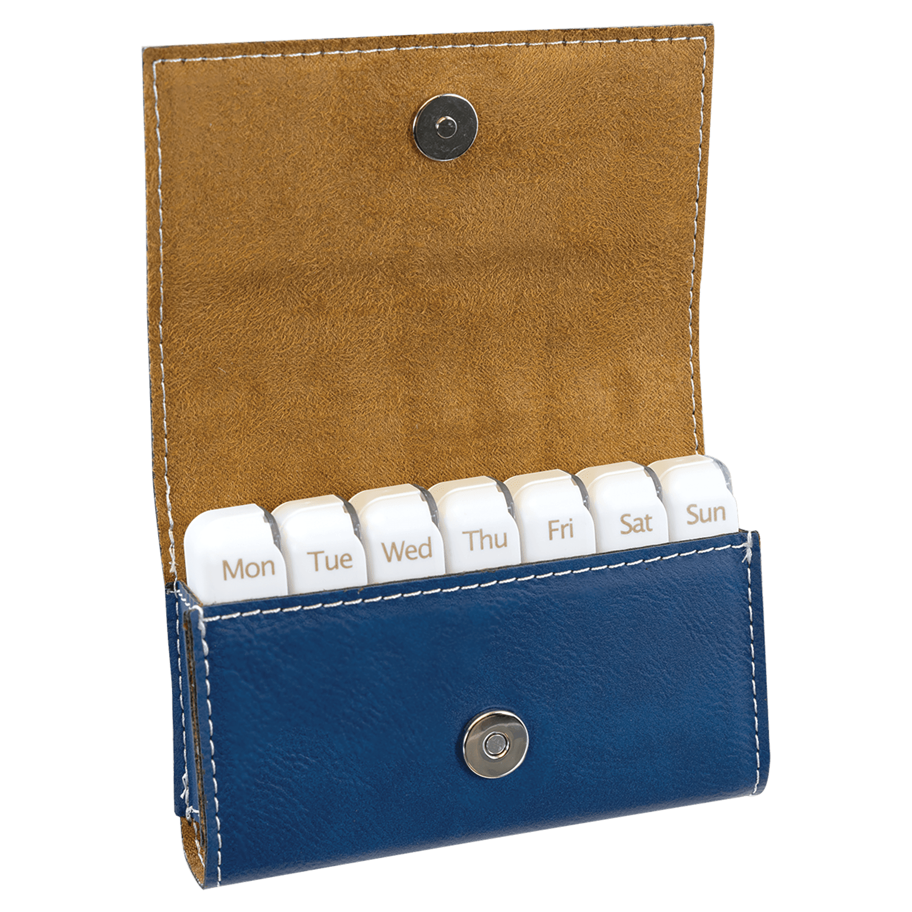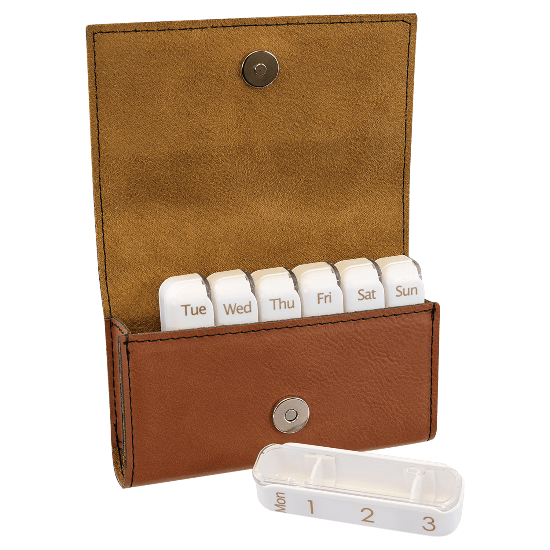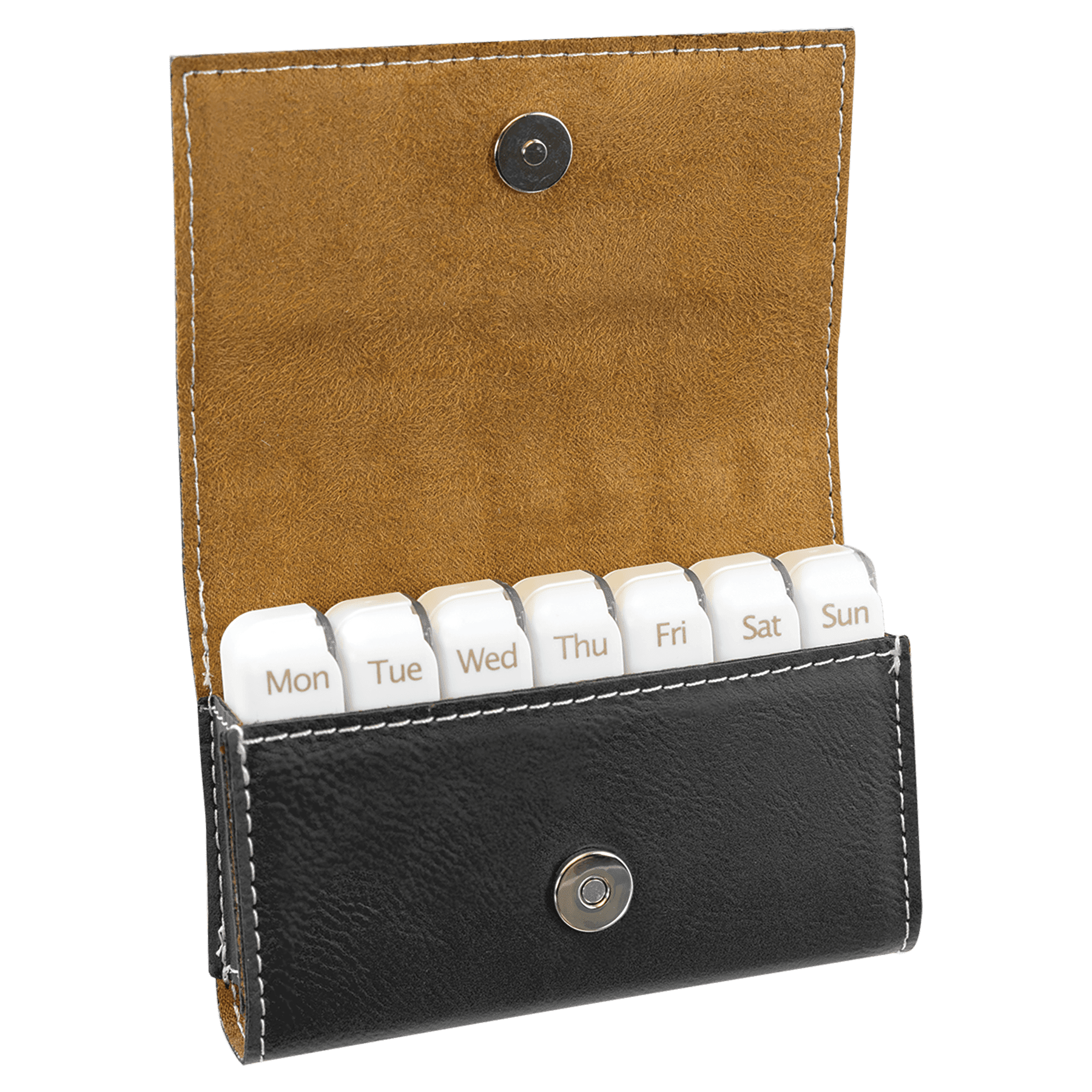 This compact Pill Box is perfect to slip into your purse, briefcase, or suitcase for a safe way to travel with the pills you need, or to have them ready to go at home! Inside the Leatherette case is a plastic organizer with 7 large compartments labeled with the days of the week. The Leatherette can be personalized using your laser for a bold contrast or UV printer for full color to create an attractive, useful gift or promotional item. The Leatherette case has a magnetic closure.