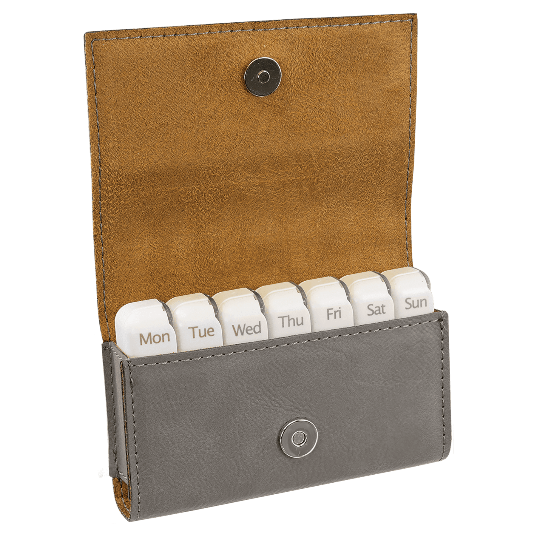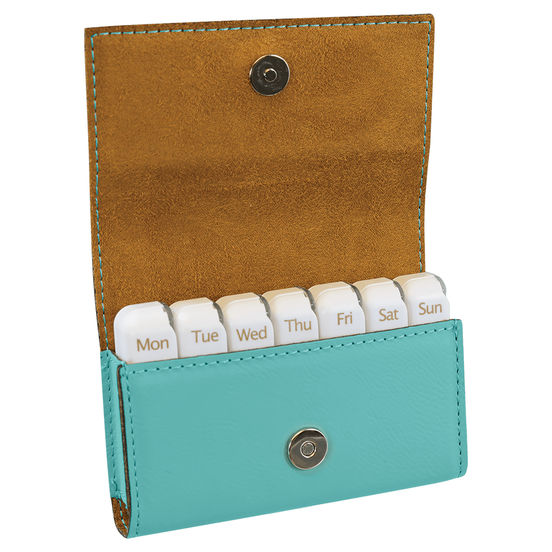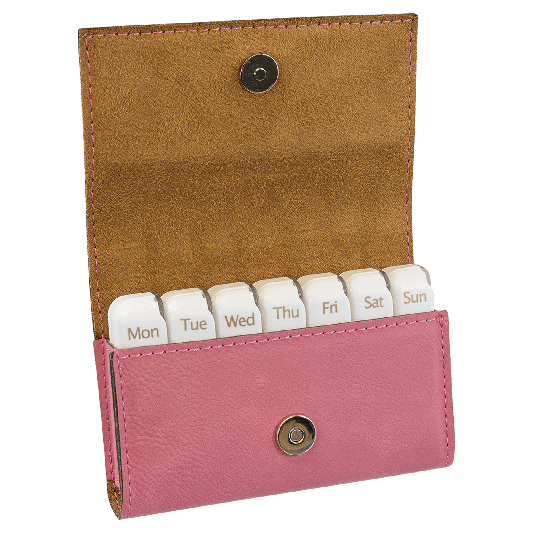 This compact Pill Box is perfect to slip into your purse, briefcase, or suitcase for a safe way to travel with the pills you need, or to have them ready to go at home! Inside the Leatherette case is a plastic organizer with 7 large compartments labeled with the days of the week. The Leatherette can be personalized using your laser for a bold contrast or UV printer for full color to create an attractive, useful gift or promotional item. The Leatherette case has a magnetic closure.